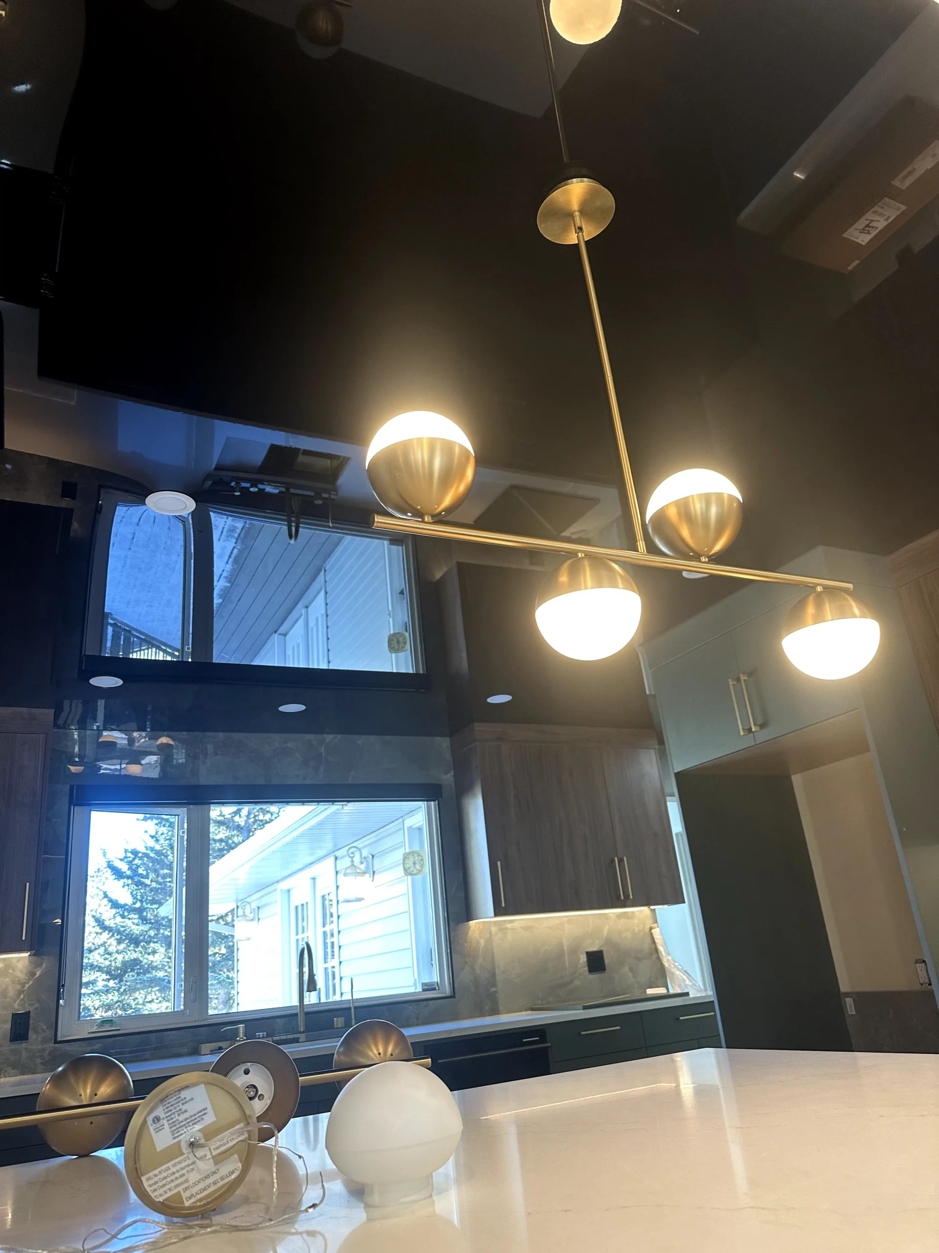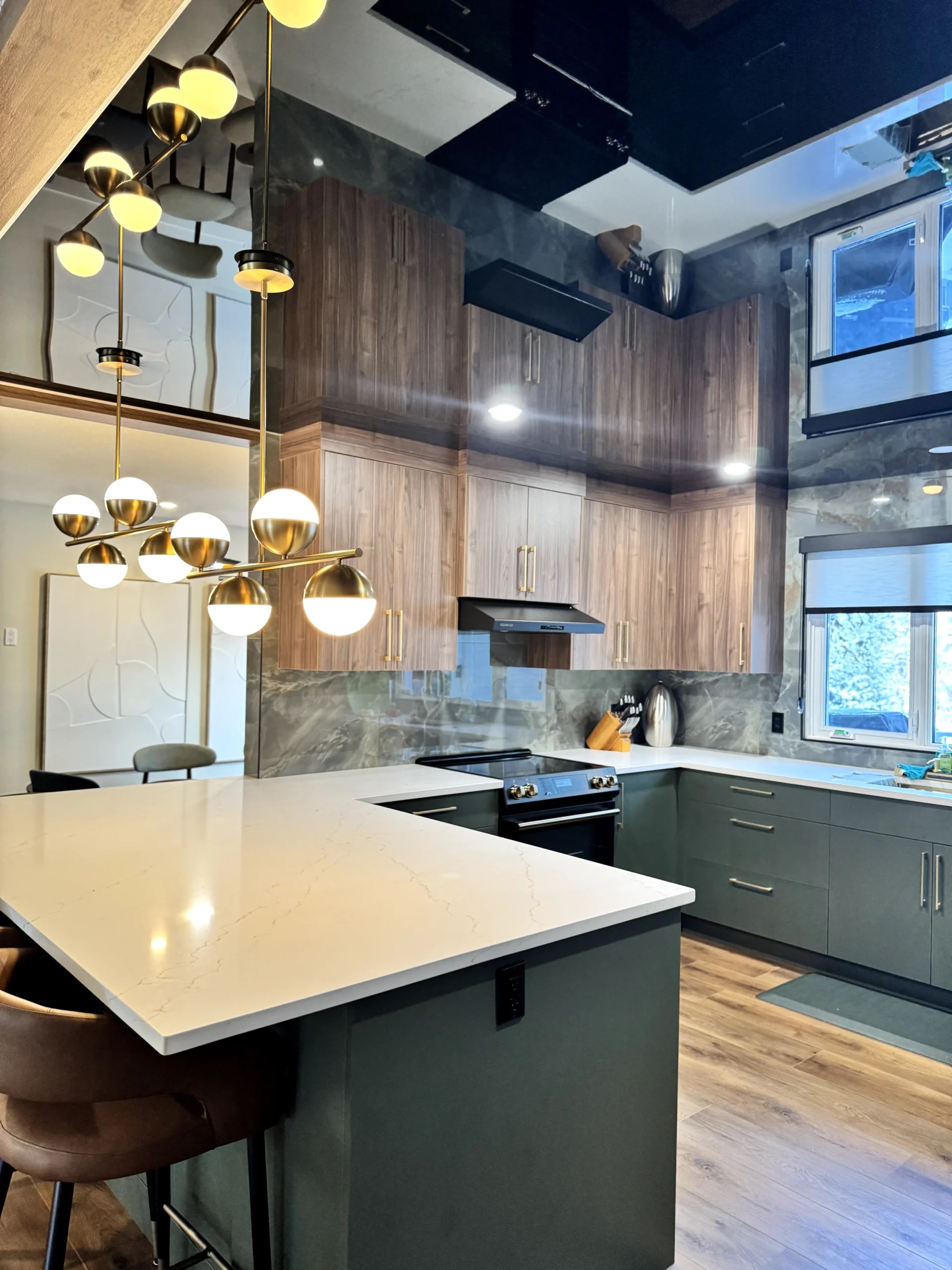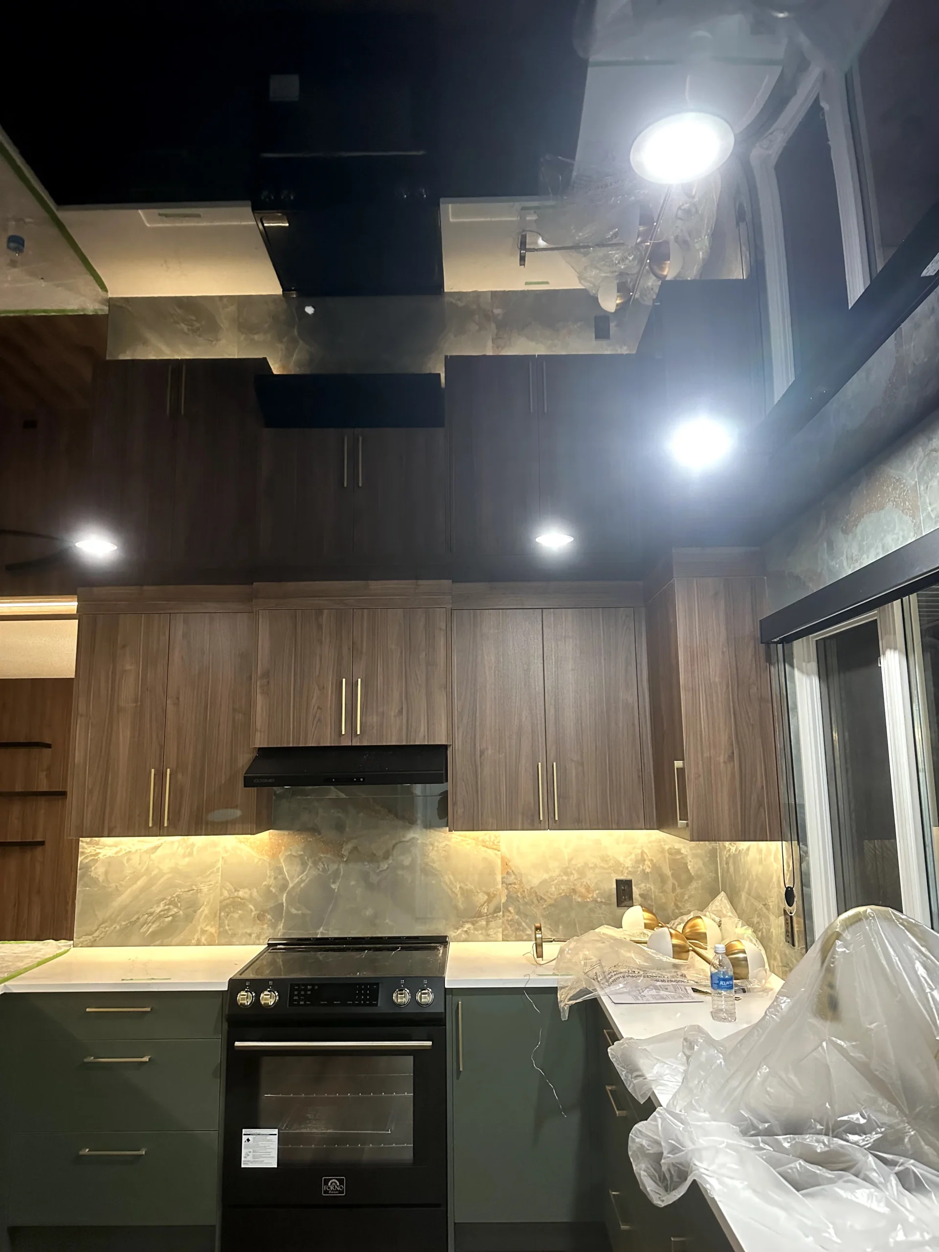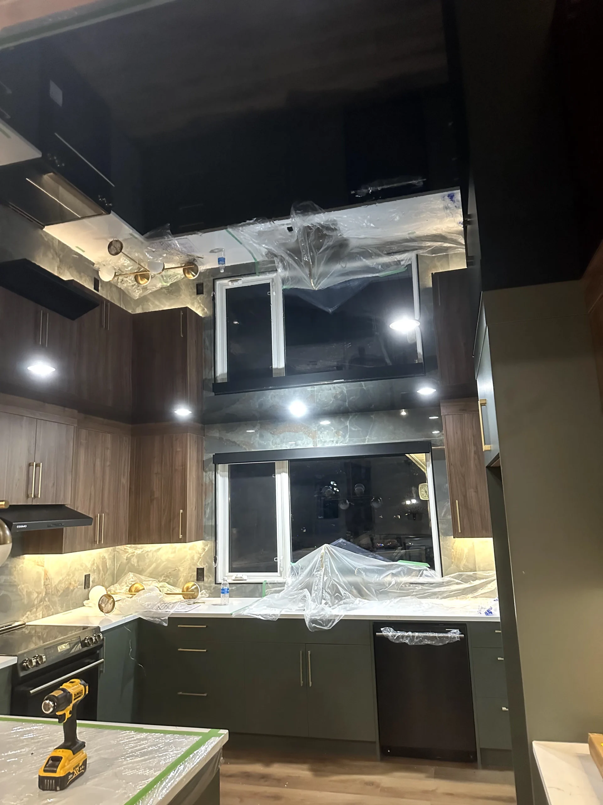 We installed a black high-gloss stretch ceiling to create depth, reflection, and a strong architectural presence. The glossy surface amplifies natural and artificial light, visually expanding the kitchen while maintaining a refined, modern aesthetic. Unlike traditional drywall, the stretch ceiling delivers a perfectly smooth finish with no joints, cracks, or repainting over time.