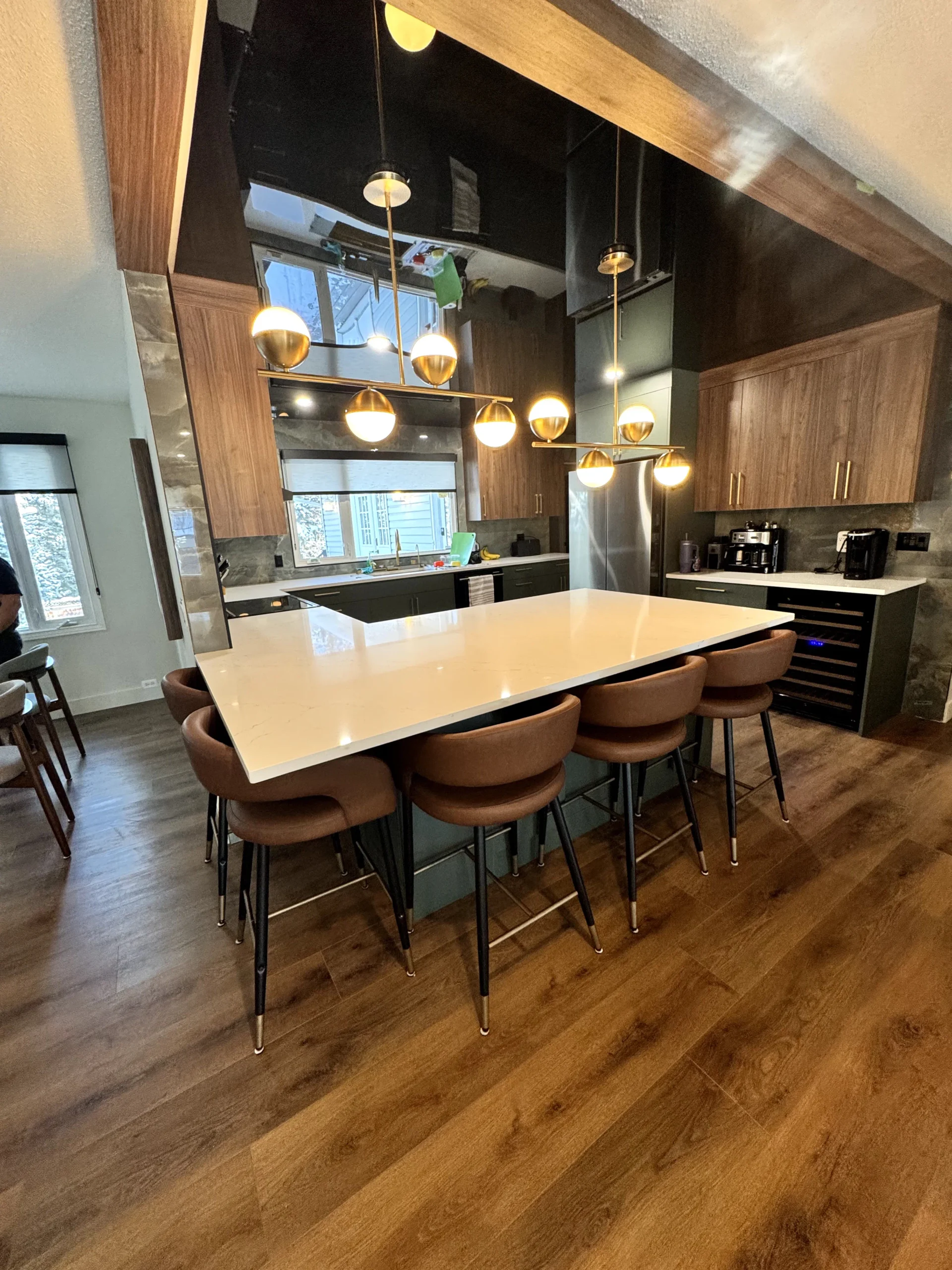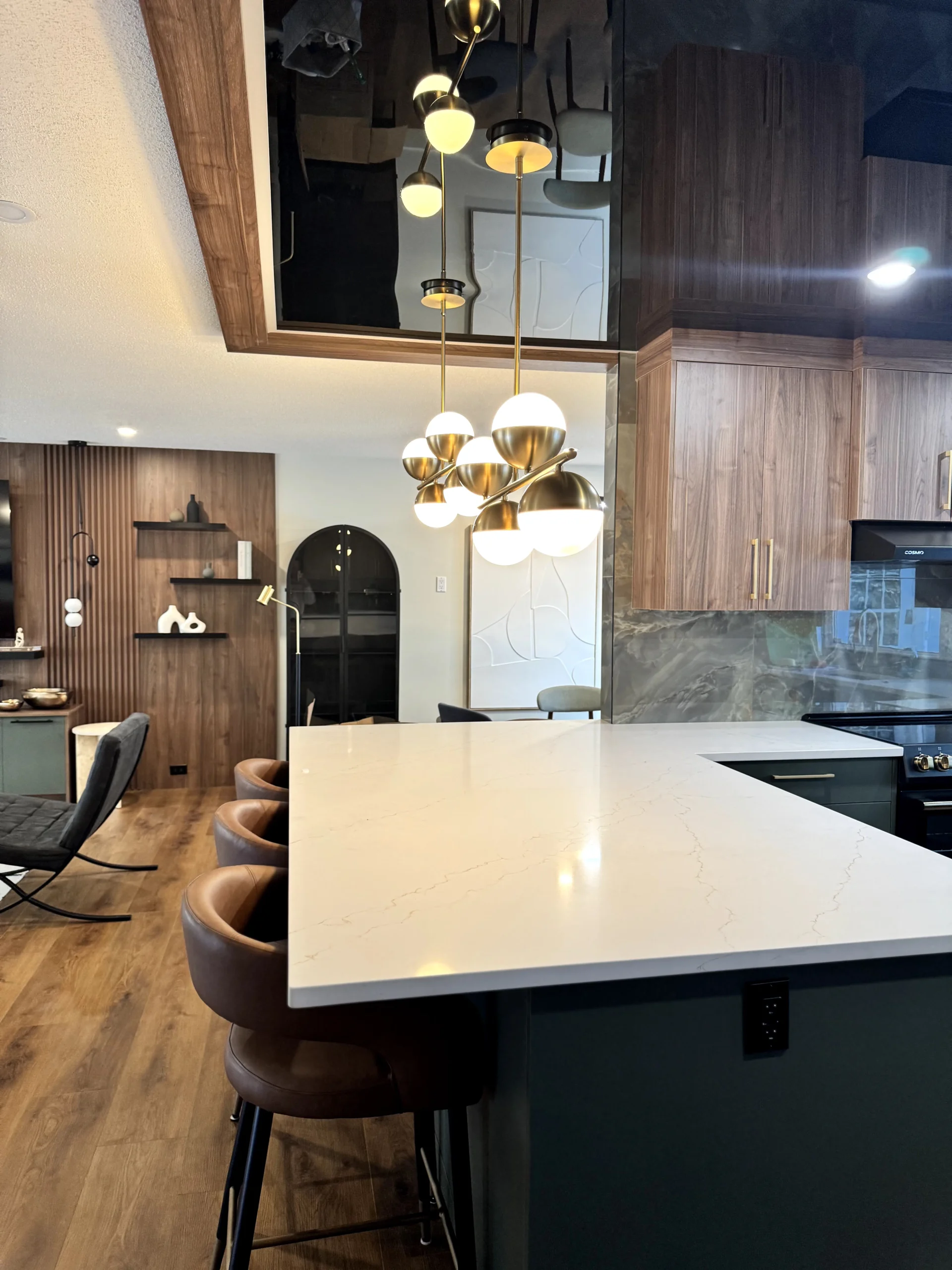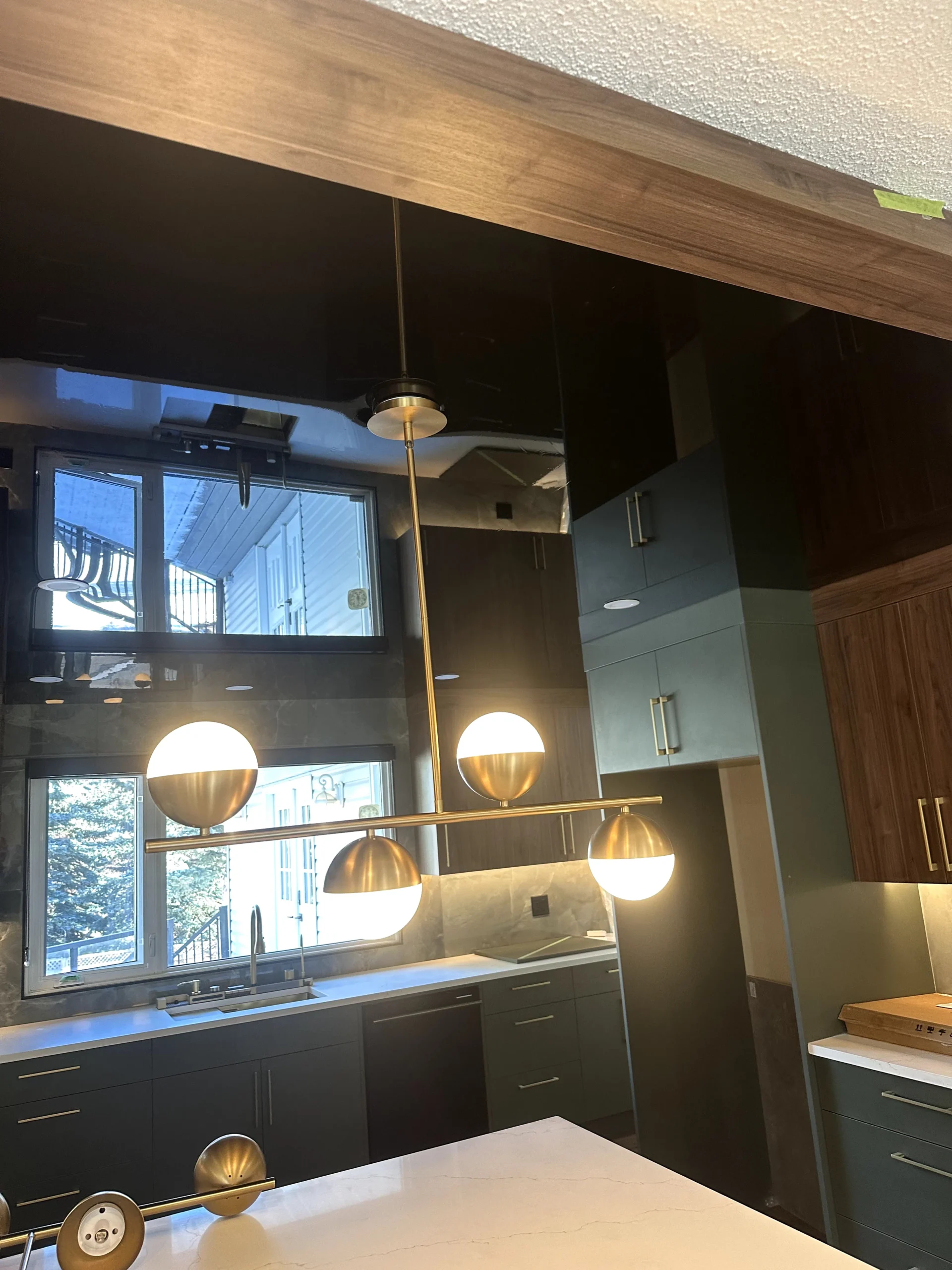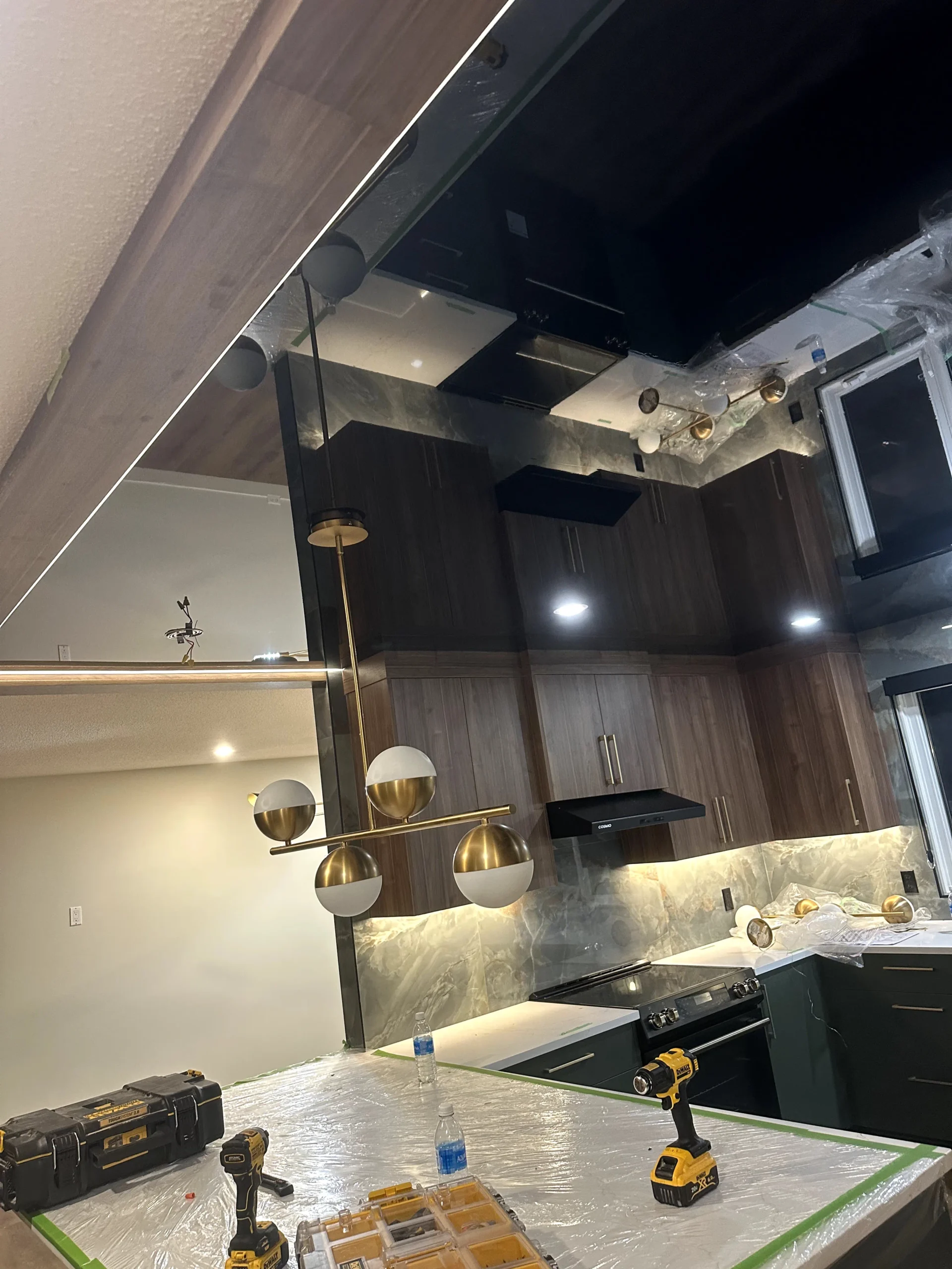 We installed a black high-gloss stretch ceiling to create depth, reflection, and a strong architectural presence. The glossy surface amplifies natural and artificial light, visually expanding the kitchen while maintaining a refined, modern aesthetic. Unlike traditional drywall, the stretch ceiling delivers a perfectly smooth finish with no joints, cracks, or repainting over time.