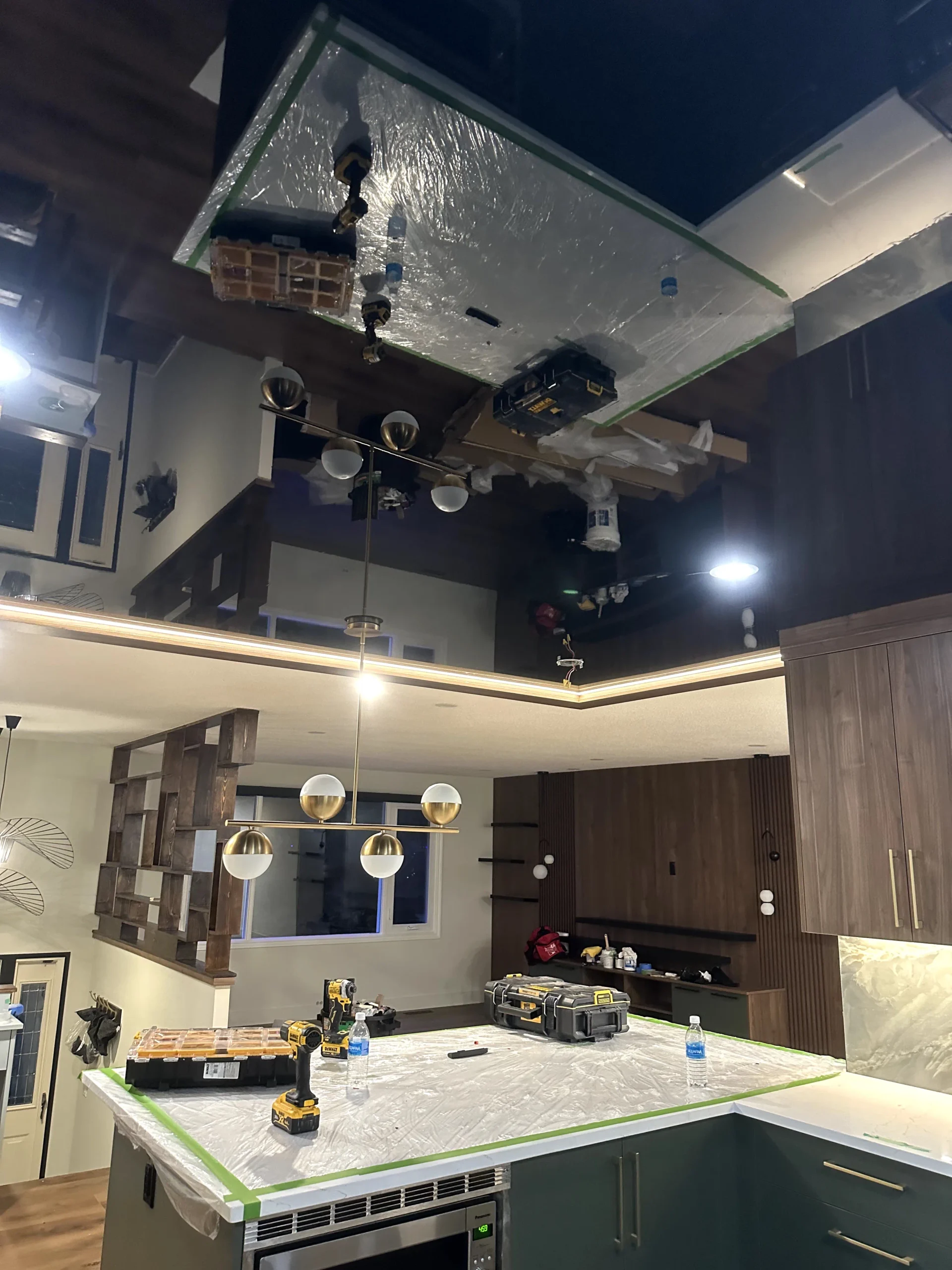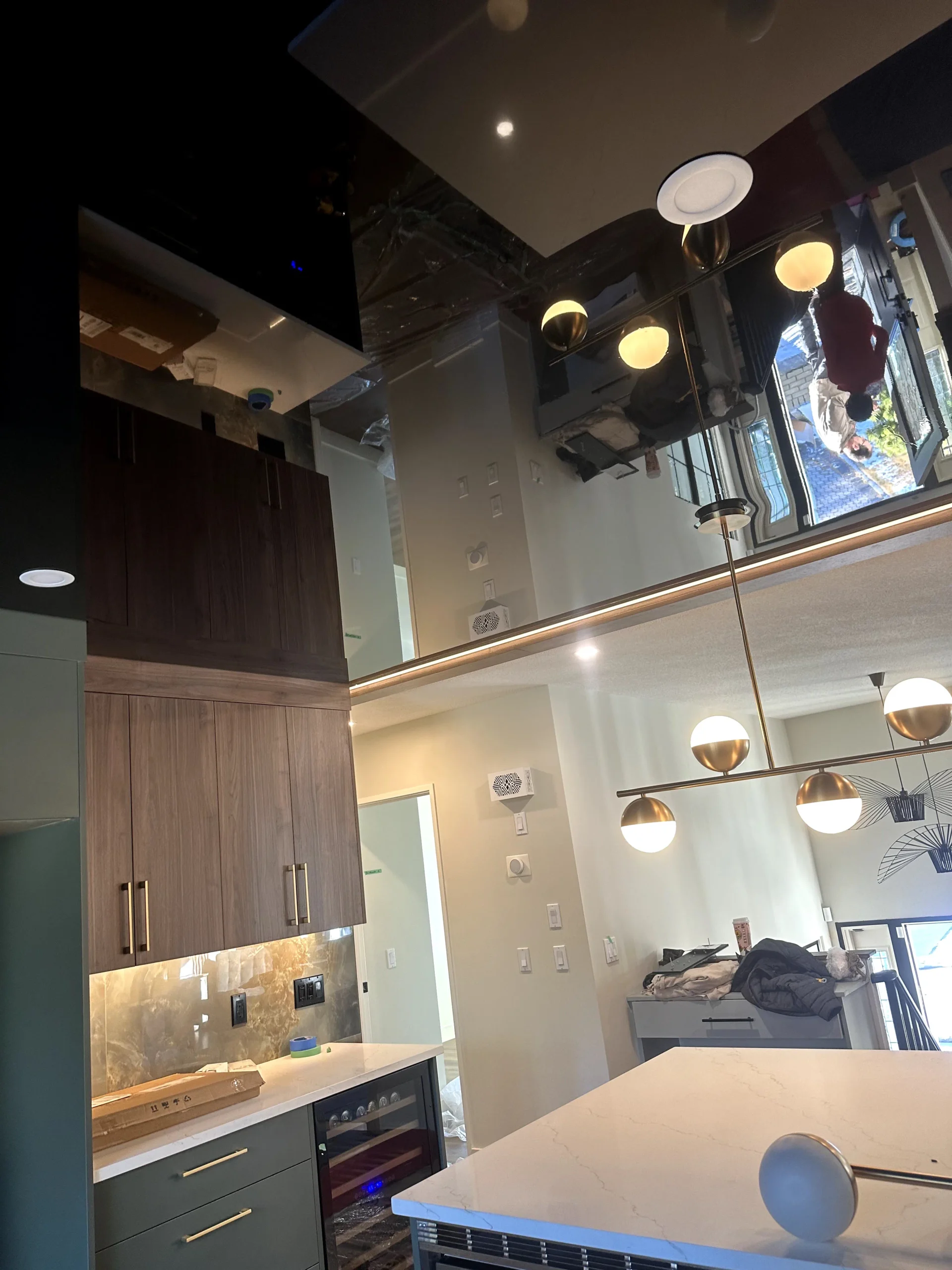 A high-gloss ceiling was selected to reflect light, visually expand the space, and create a clean architectural finish. Stretch ceilings also eliminate common drywall issues such as cracking, uneven surfaces, and repainting over time.